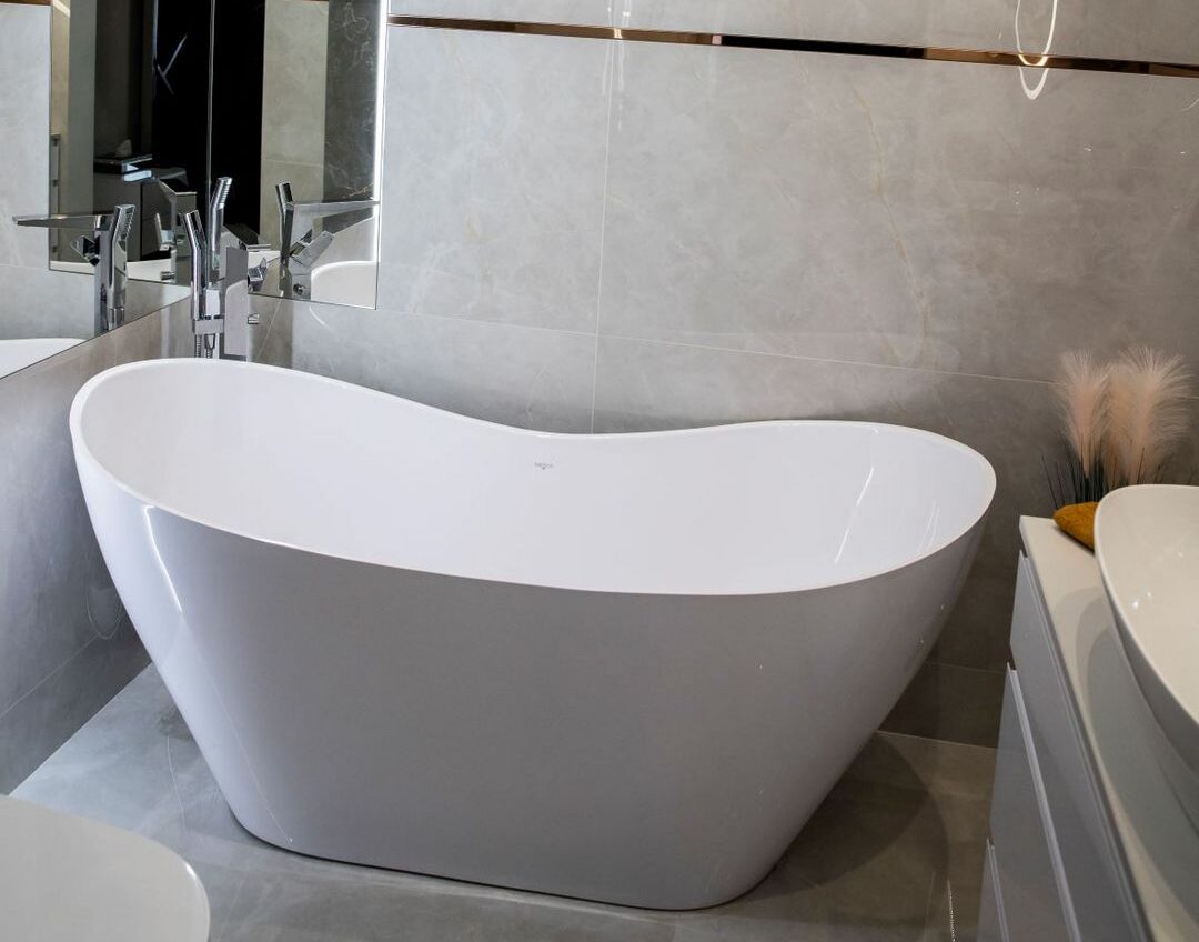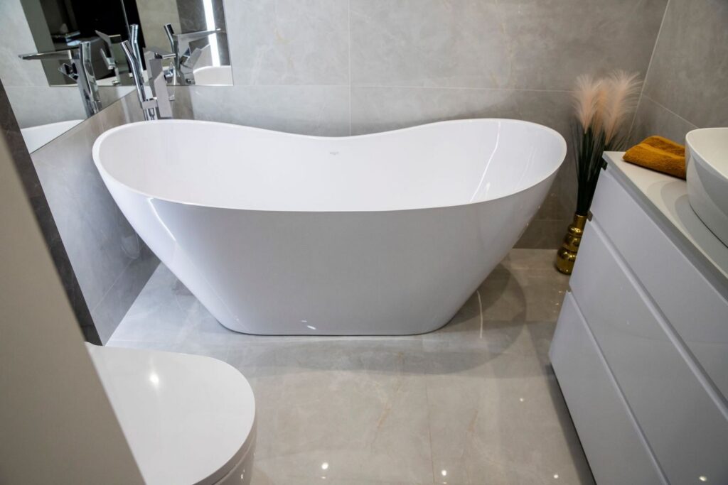 Łazienka w kolorach szarości z wanna wolnostojącą